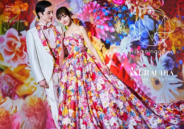 薔薇のブーケが大胆に花嫁を飾り立てドラマティックな仕上がりに。ボリューミーで立体的に飾り付けられたブーケはオーガンジーの柔らかな質感でエレガントとロマンティックを融合し大人スイートモードを演出。パフスリーブ、フレアデコルテ、ブーケのオーバースカートを付け替えると自由自在のマルチウェイの着こなしで表情を変えれる。